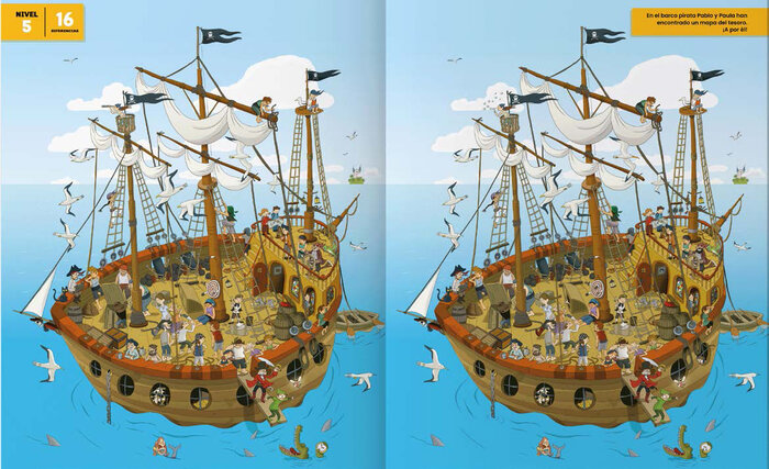 Paula y Pablo se embarcan en un viaje extraordinario hacia una isla mis-teriosa. Observa que cada escenario aparece dos veces, pero con algunas pequeñas diferencias.