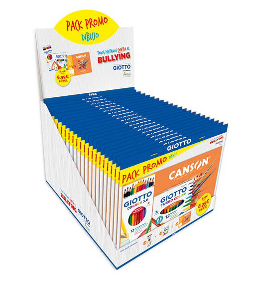 giotto pack promo dibujo en display de 20 unidades contiene: 1 minipack basik dibujo A4 10 hojas 130gramos 1 estuche 12 lapices de colores giotto colors 3.0 1 estuche 12 rotuladores giotto turbo color
