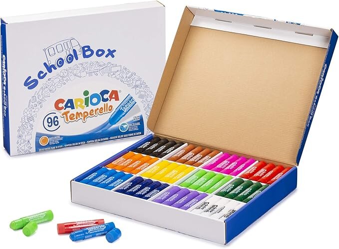 Producto: Set de 96 témperas sólidas en barra. Colores mezclables entre ellos, brillantes y cubrientes. Uso: Colorea con tempera sin necesidad de usar agua y jabón. Lo puedes utilizar sobre papel, cartón, cartulina, madera, goma eva y cualquier otra superficie porosa. Secado rápido y no arruga el papel Colores: Colores brillantes surtidos muy cubrientes. Acabado satinado, no necesita barniz protector. Consejos: Apto para niños y adultos para usar en el colegio y durante el tiempo libre Extra: No contiene solventes