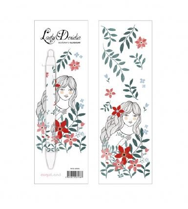 Bolígrafo de clic con ilustración a todo color de Lady Desidia. Tinta negra Recambios estándar. Fabricado por BIC. Presentado en packaging personalizado de cartón impreso a color doble cara y funda de plástico.