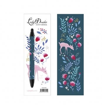 Bolígrafo de clic con ilustración a todo color de Lady Desidia. Tinta negra Recambios estándar. Fabricado por BIC. Presentado en packaging personalizado de cartón impreso a color doble cara y funda de plástico.