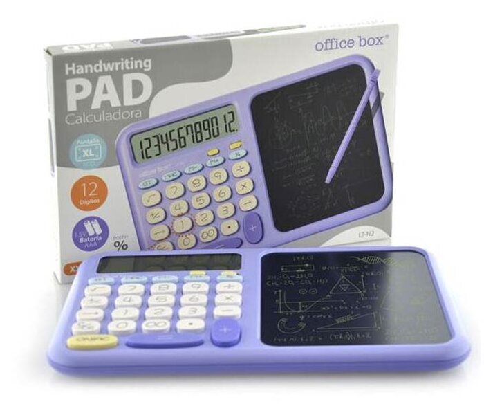 Modelo LT-N2 Handwriting Pad 2 en 1 con calculadora y pad digital ? Calculadora Office Box LT-N2 combinada con superficie de escritura LCD reutilizable de 10.5 x 13 cm, puntero extraíble en la parte trasera, botón de bloqueo/desbloqueo y borrado rápido para notas temporales sin papel, disponible en morado y negro.