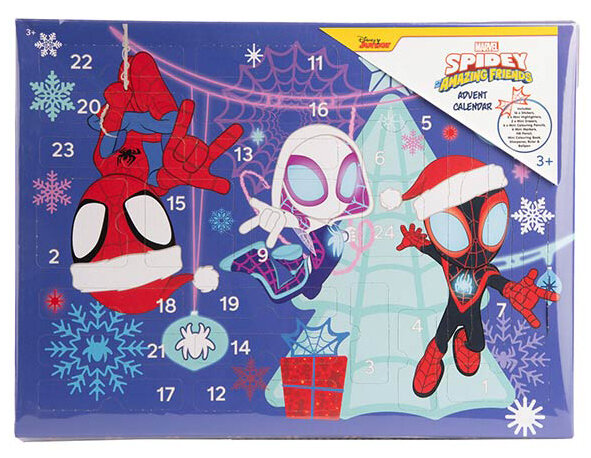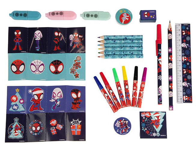 SPIDEY: Calendario de adviento. CARACTERISTICAS: Disfruta de la llegada de la Navidad con este completo calendario de adviento. Cada día una sorpresa diferente. Contenido: 6 rotuladores, 2 gomas, 6 lápices de colores, 16 pegatinas, 3 subrayadores, 1 sacapuntas, 1 cuaderno para colorear con 10 dibujos diferentes y 10 hojas en blanco, 1 lápiz HB, 1 regla, 1 bolígrafo. PRODUCTO DE CALIDAD: Diseñado en España siguiendo todos los procesos de fabricación y calidad de acuerdo con la normativa europea. Utilizamos materiales resistentes y de gran calidad en todos nuestros productos poniendo gran esfuerzo en crear diseños especiales para ti. MARCA: Este producto licenciado es oficial y 100% original.
