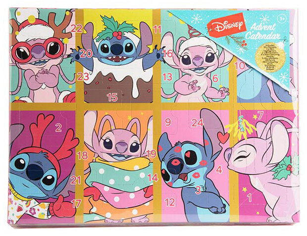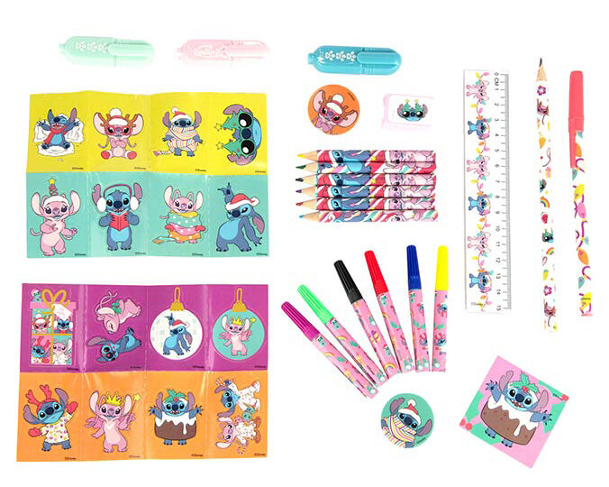 STITCH: Calendario de adviento. CARACTERISTICAS: Disfruta de la llegada de la Navidad con este completo calendario de adviento. Cada día una sorpresa diferente. Contiene: 6 rotuladores, 2 gomas, 6 lápices de colores, 16 pegatinas, 3 subrayadores, 1 sacapuntas, 1 cuaderno para colorear con 10 dibujos diferentes y 10 hojas en blanco, 1 lápiz HB, 1 regla, 1 bolígrafo. PRODUCTO DE CALIDAD: Diseñado en España siguiendo todos los procesos de fabricación y calidad de acuerdo con la normativa europea. Utilizamos materiales resistentes y de gran calidad en todos nuestros productos poniendo gran esfuerzo en crear diseños especiales para ti. MARCA: Este producto licenciado es oficial y 100% original.