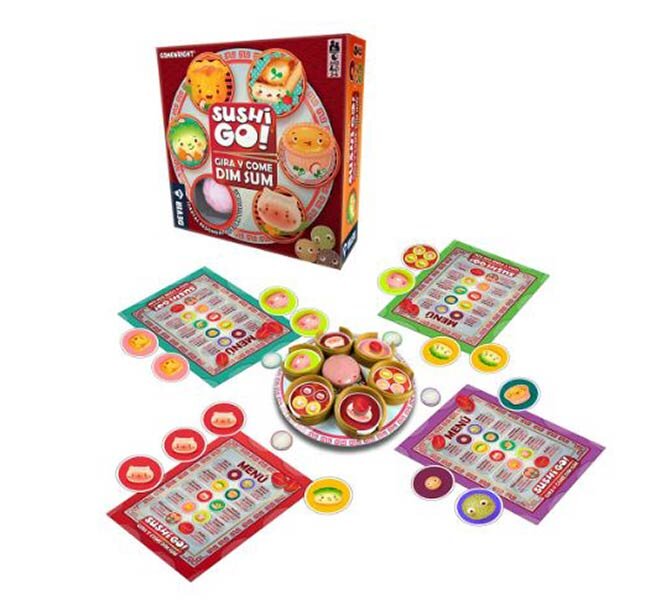 ¡Bienvenidos al restaurante, comensales! Tomad asiento alrededor de esta magnífica mesa giratoria y preparaos para probar los mejores bocados de la cocina oriental. Sushi Go! Gira y come dim sum es un juego completamente independiente del universo Sushi Go, que comparte estética y algunas mecánicas con el clásico juego de cartas. No hace falta tener, conocer o haber probado el juego original para disfrutar de este título. Diseñado por Quentin Weir y Ken Gruhl e ilustrado por Nan Rangsima, se puede disfrutar en pareja o en grupos de hasta 6 jugadores, a partir de 8 años, en partidas de unos 20 minutos de duración. Inspirado en el clásico de Phil Walker-Harding, este juego le da todo un giro a Sushi Go! En vez de jugar con cartas de sushi lo haremos con unos deliciosos dim sum. El objetivo del juego consiste en reunir la mejor combinación de platos de dim sum, cada uno de los cuales puntúa de modo distinto. Tras doce rondas, quien tenga más puntos ganará la partida. Además de contener más de 100 cartas de dim sum, esta edición incluye una mesa giratoria con 6 cestas, 30 fichas, un bollito suave a tamaño real y 6 menús (que actúan como tableros personales). Una vez desplegado, el juego luce de maravilla, creando la apariencia de que los jugadores se encuentran en un restaurante. ¡Mejor que no os sentéis a jugar con hambre! En su turno, cada jugador toma la carta superior de la pila que se encuentra en la cesta de vapor que tiene enfrente y también las fichas de palillos que haya dentro. A continuación, debe dejar la carta sobre uno de los espacios libres de su menú. Si el jugador prefiere una carta que está en otra cesta de vapor, puede girar la mesa en cualquier sentido, pero en cada cesta que deje atrás deberá colocar una ficha de palillos. Sin embargo, si tienes el bollito especial, puedes devolverlo al centro de la mesa y girarla tanto como quieras sin pagar ningún coste. Una vez el menú de todos los jugadores esté lleno (o lo que es lo mismo, tras 12 rondas), la partida termina. Tal como ocurría en Sushi Go! Los jugadores suman puntos por las combinaciones de sus cartas. Por ejemplo, cada cuarteto de shaomai otorga 12 puntos (pero menos de 4 no reportan ninguno) y los panecillos al vapor solo dan puntos al jugador que tenga más (y restan a quien tenga menos). Bonito y divertido, Sushi Go! Gira y come dim sum es perfecto para jugar con amigos o en familia, especialmente con los peques de casa. Combinar cartas es todo un reto con una mesa en constante movimiento: ¡cuando llega tu turno no sabes qué cesta tendrás delante! Déjate seducir por estas delicias de la gastronomía china y prepara el menú más sabroso del restaurante.