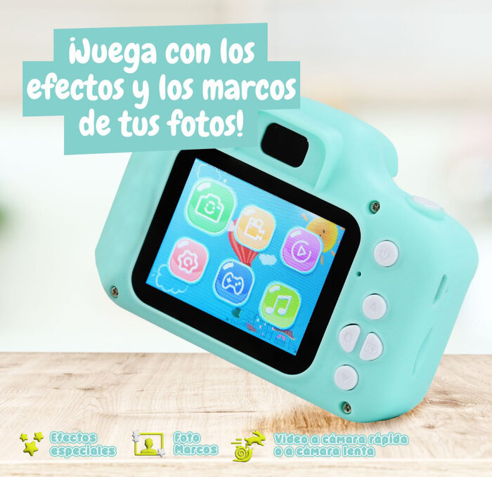La cámara es compacta y ligera, por lo que se puede llevar a cualquier parte; tiene marcos y efectos fotográficos y 5 juegos diferentes;